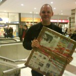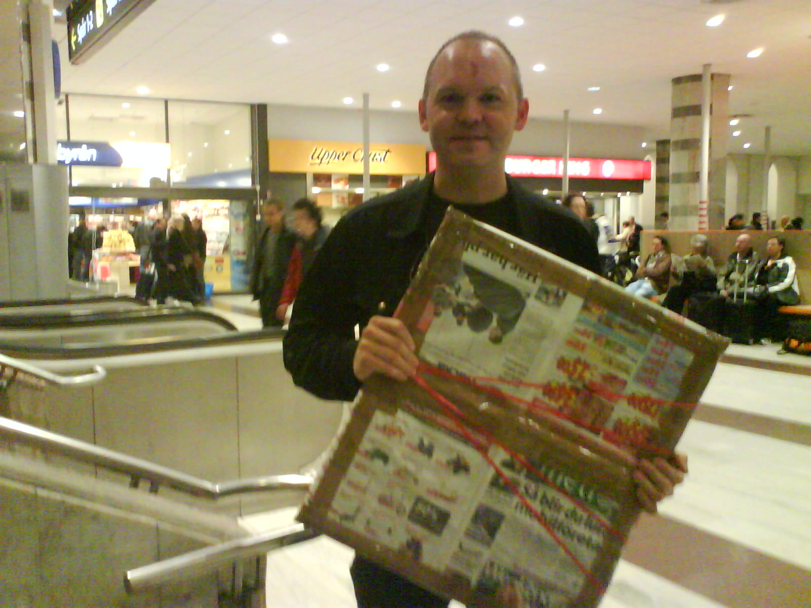 Den här gången hade jag beställt en tavla föreställande Bono i U2. Men jag fick inte betala. Dessutom kom han cyklande med den under armen hela vägen från Nacka till Centralen. Här syns han på bild med tavlan inslagen i tidningspapper.